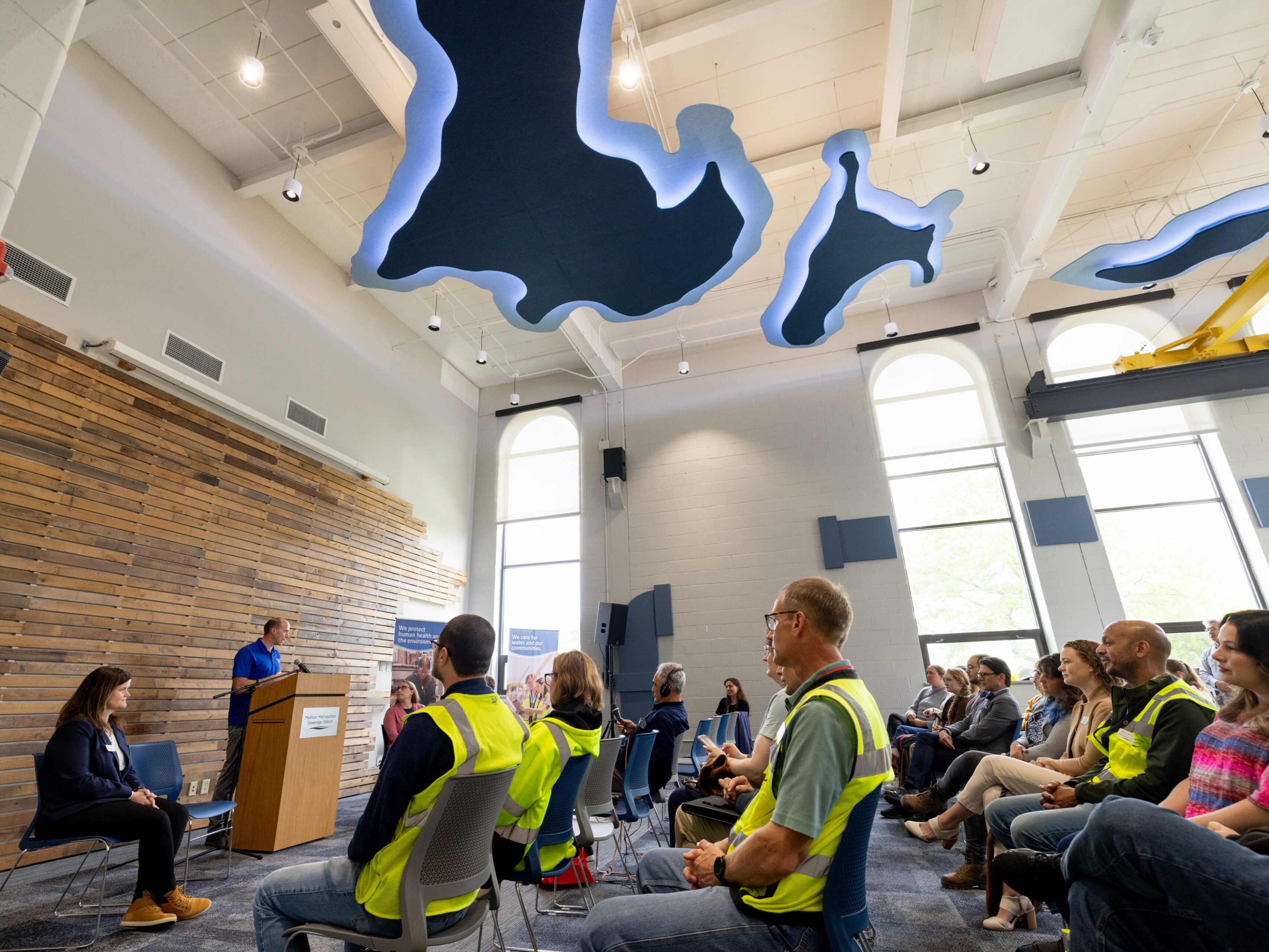 The vaulted ceilings that make the space unique, however, presented a problem for acoustics, which made communication in the space difficult. The intent of Shop One is to engage and empower water stewards in a flexible, functional and inviting workspace that invites community members to experience the District’s work and inspire creative approaches to the future. As such, we didn’t want standard fiberglass acoustical panels, but a creative solution that embodied the mission of the space. The final design, created and installed by Strang Architects, depicts the Yahara chain of lakes and installation was completed in early 2020.